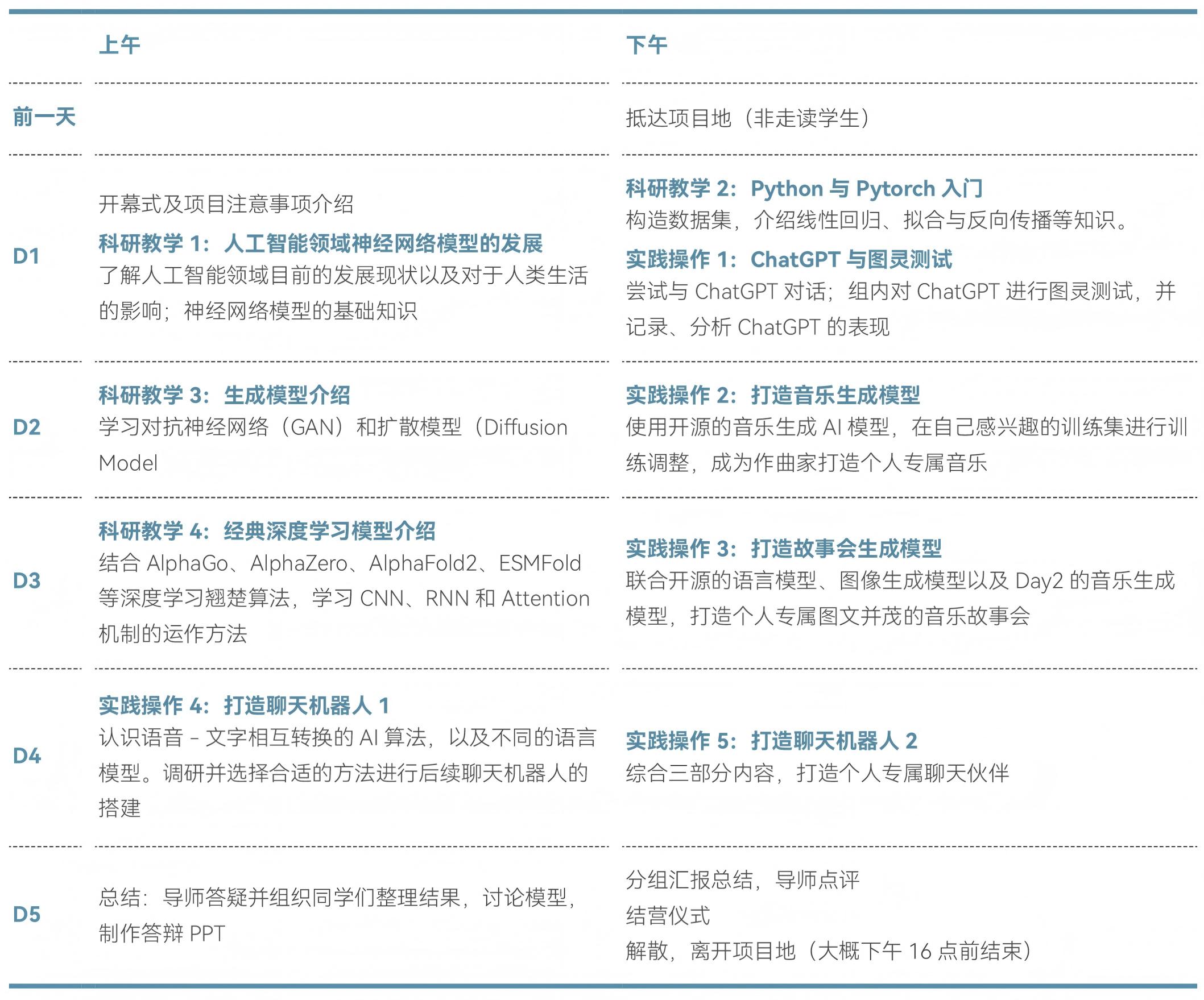 本项目邀请人工智能领域科研专家指导,带领学生深入了解 AI 人工智能的核心思想,并通过打造专属的音乐、故事、聊天机器人等 AI 模型实践来掌握神经网络的运作机制,构建基本的 AI 模型,并深度理解如何使用 AI 解决实际问题。